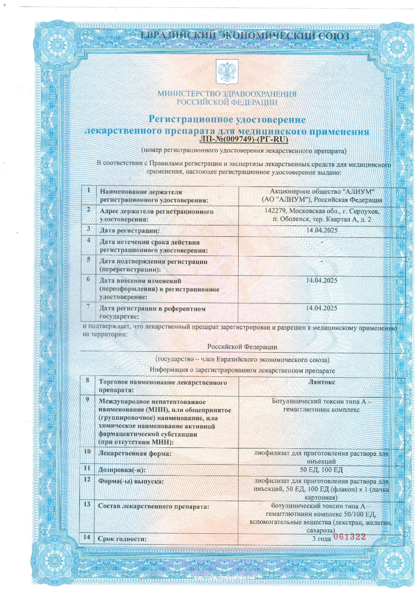 ЛАНТОКС® - ботулинический нейропротеин типа А. Миорелаксант периферического действия. Преимуществом препарата является наличие в его составе желатина, который более нейтрален к человеческим тканям.